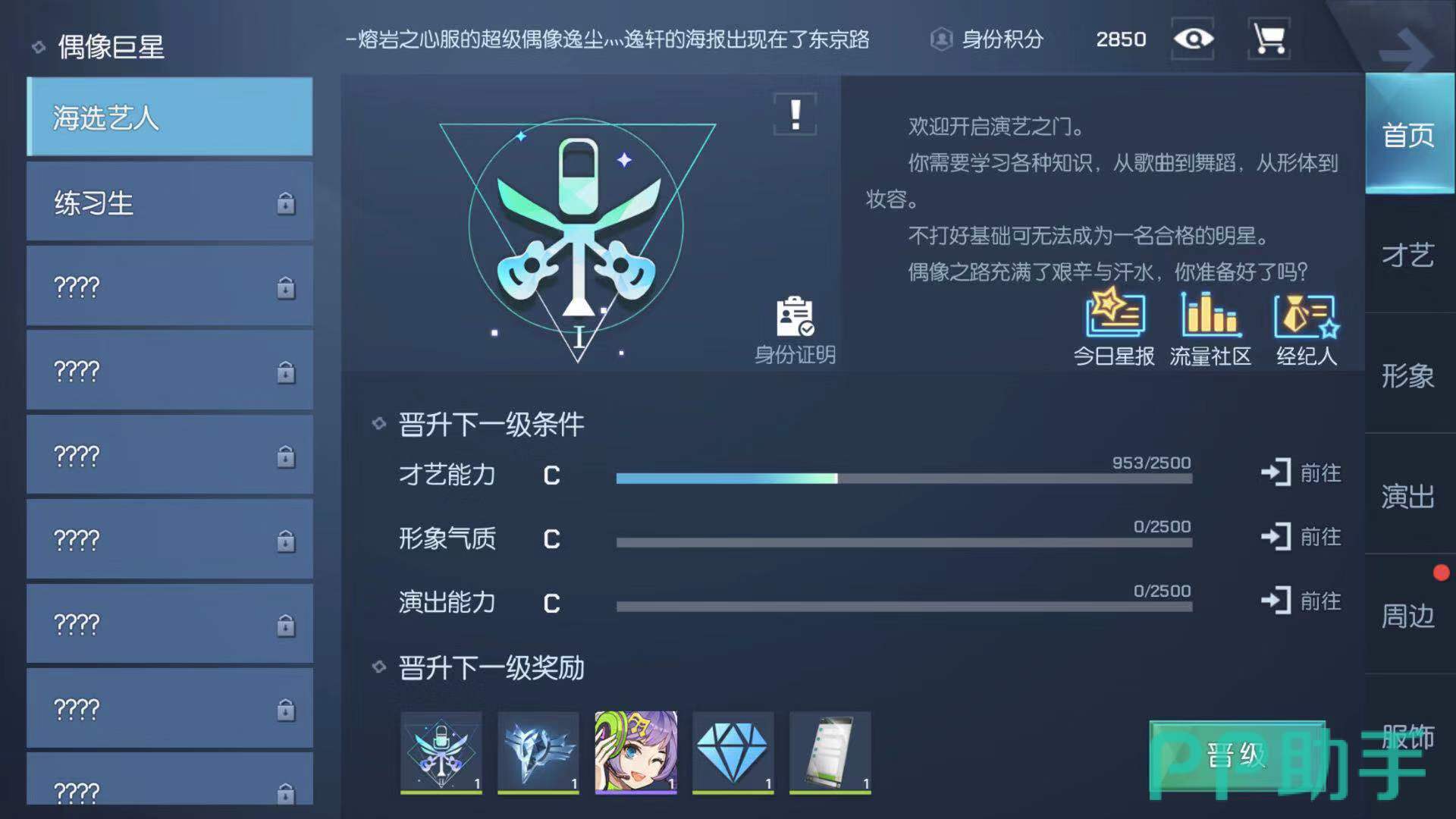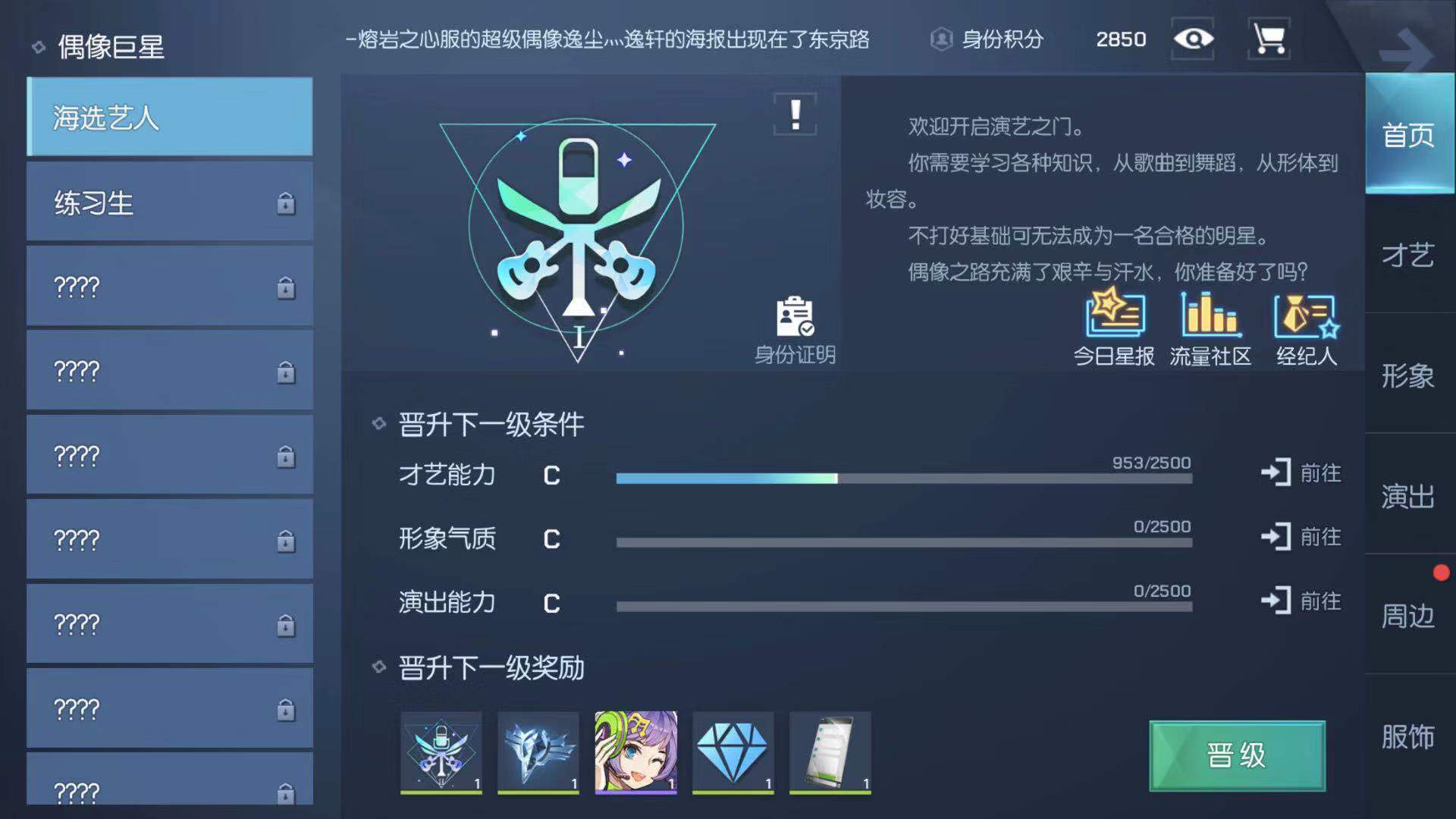 偶像的晋级之路:偶像晋级主要是完成才艺、形象、演出三个方面的熟练度。这个晋级比厨师稍微难一些,因为需要的熟练度就高了1000点,等级越高和厨师的差距应该就越大,毕竟是做大明星嘛,吃点亏没事的。