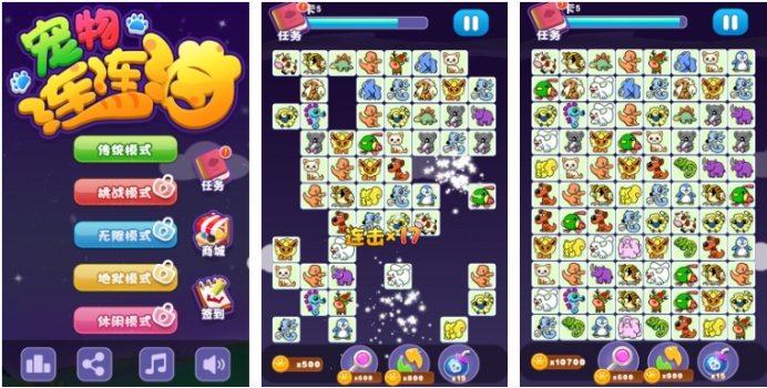 玩家只需要将两个一样的小宠物连接在一起,就可以将他们消除了,看着满屏幕的小宠物,让人感到非常愉悦呢,结合将几个小宠物消除的爽快音效与步步高升的连击数,可以说是非常的解压。除了常规模式之外,这游戏还为不同习惯的玩家提供了一些不一样的挑战模式和更多有趣新颖人的模式,而且这款游戏的难处也不用担心放弃,在这款游戏中开发商为大家提供了许多辅助道具,以帮助大家轻松通关。