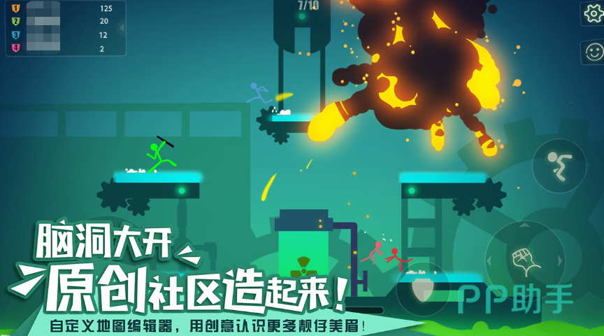 大家别看游戏内的火柴人角色很是简单,但是其玩法却是非常的有趣味性,100多张奇葩的地图,还有各种爆笑的脑洞武器,玩家都是可以进行体验的。同时在这里我们还可以自主创造地图,邀请其他玩家在自己的地图内进行冒险战斗,更多脑洞玩法超乎大家想象。游戏拥有很多神奇操作模式,我们可以通过地图编辑来达到创作的目的,创作出来地图还可以分享给全服玩家,与更多火柴人伙伴一起进行对决,同时每一个玩家都能成为段子手,我们可以在游戏大厅发布弹幕,每一句呐喊都能被所有玩家看到。