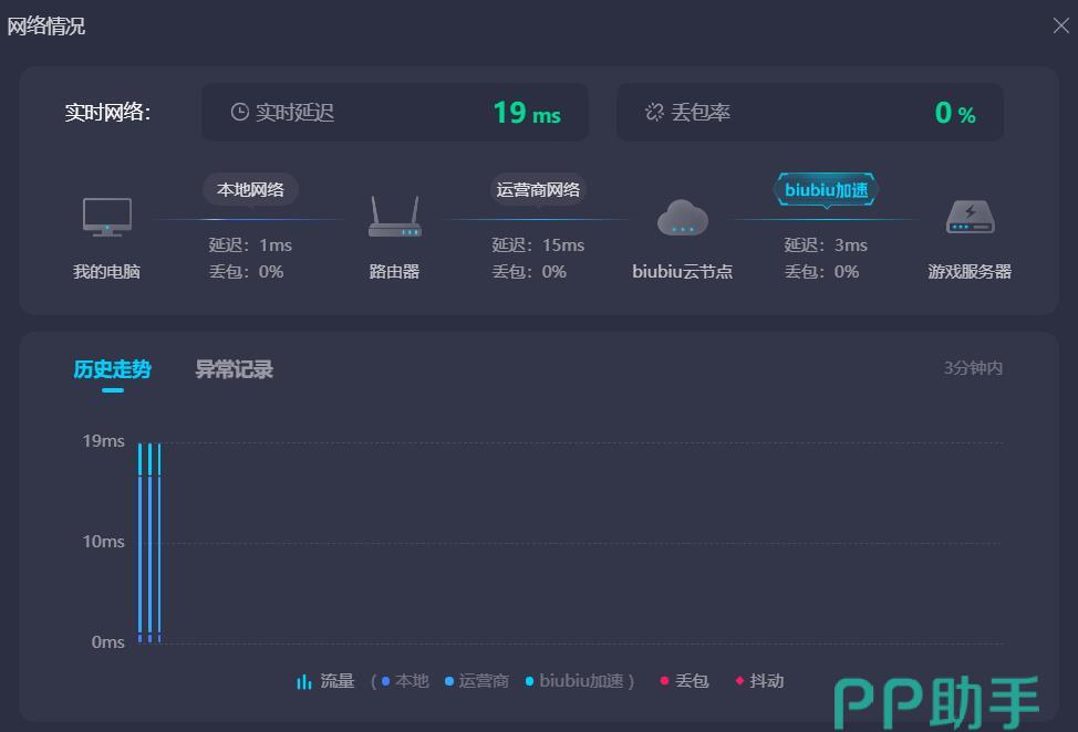 biubiu加速器中的优化功能启动后,系统会实时监测网络的情况,期间要是出现了波动或高延迟都会及时标注出来,方便大家去查看,在对应的界面内还能看到本地网络、运营商网络以及biubiu云节点的延迟数据。