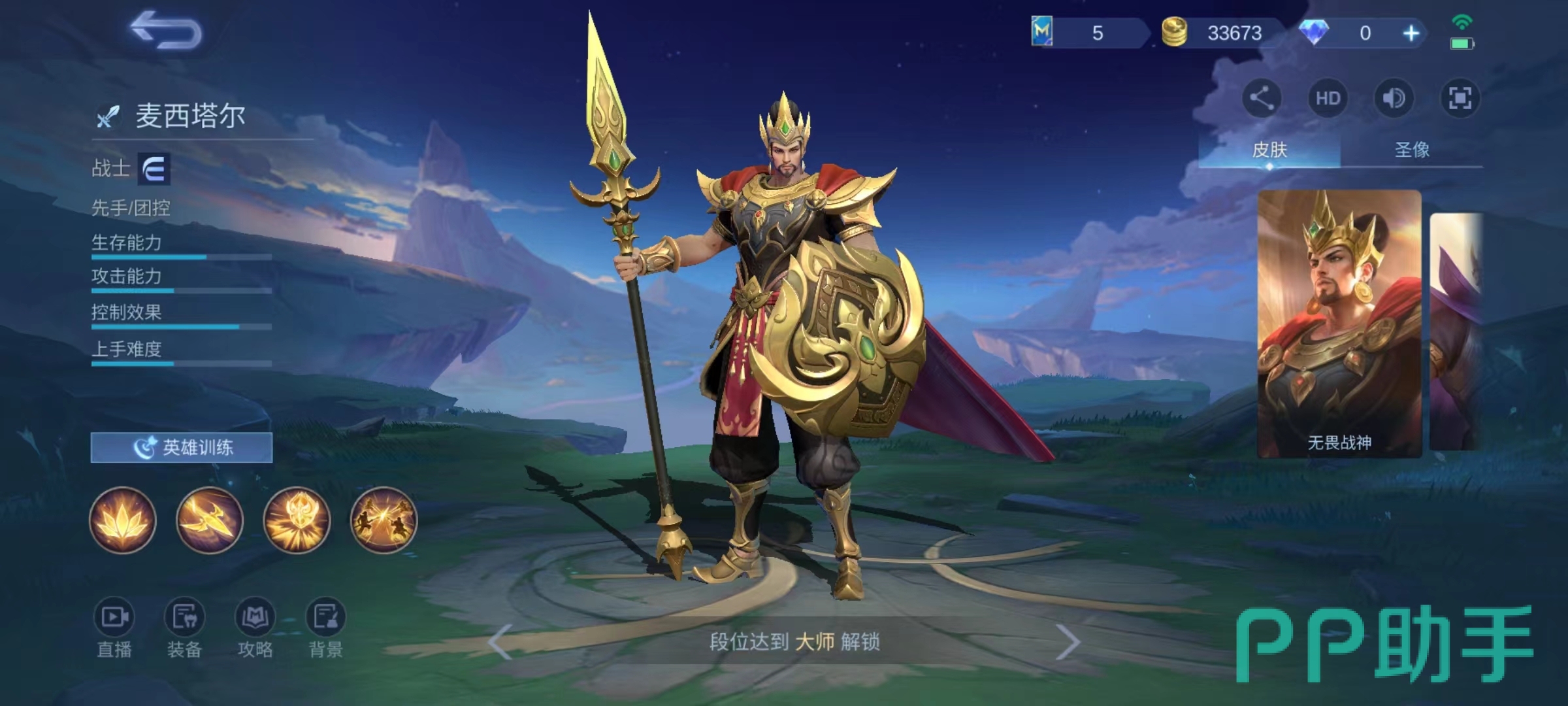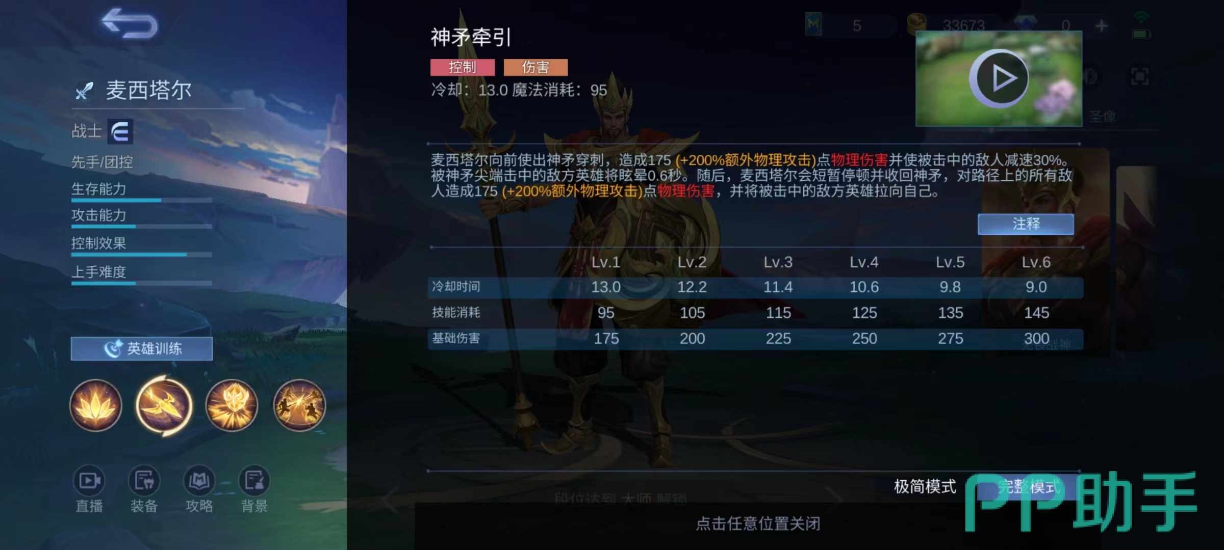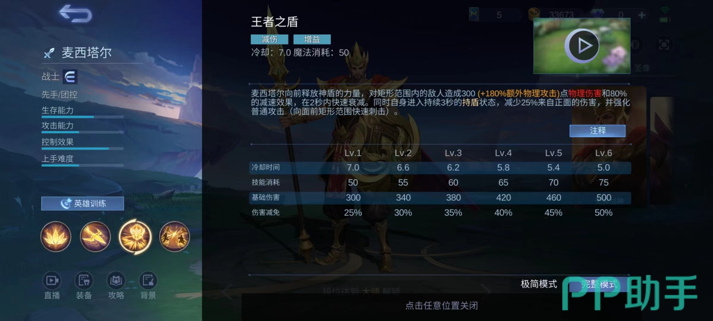 一技能将手中的长矛刺出造成伤害,并使敌人减速,如果被长矛尖端刺中,还将附加短暂眩晕。随后在短暂停顿后将长矛收回,对路径上的所有敌人造成物理伤害,还能将被击中的敌方英雄拉回自身所在位置。技能伤害范围比较长,大多数远程例如射手和法师都难以躲过此技能的伤害。二技能王者之盾,将神盾的力量释放出去,造成范围内物理伤害和减速,自身在接下来的三秒内处于持盾状态,受到来自正面的伤害减少,并强化普通攻击。注意只能减少来自正面的伤害,要及时调整自身的角度和朝向。