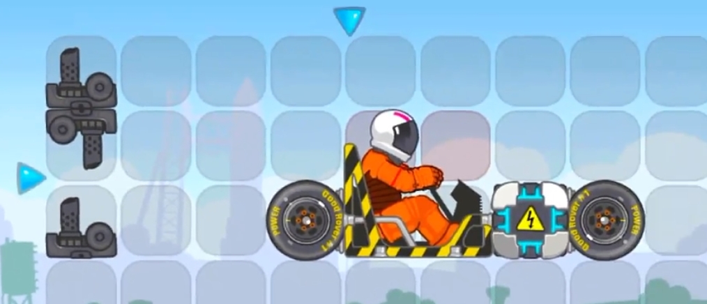 那这个卡丁车在游戏中是否能够有好的驾驶效果。这个车型搭配了电池和两个快速转动的运动轮胎在行驶起来的速度还可以,在遇到高坡起跳时会有翻转,不过只要配合好玩家的操作还是能够平稳着地。在前期的新手村和水星两个星球上是能够轻松过关的。到了后续的关卡上可能就会需要加装涡轮和三脚架来稳固车身。