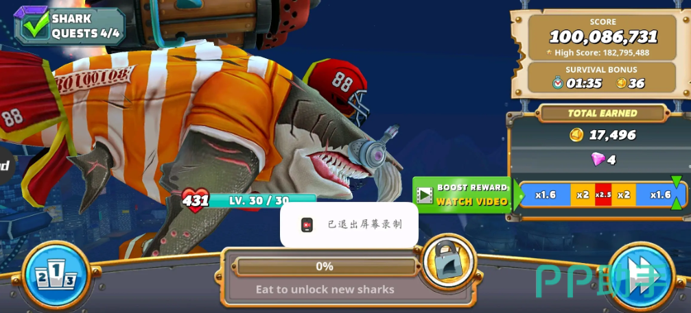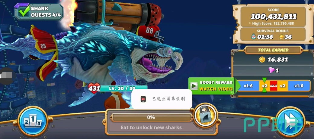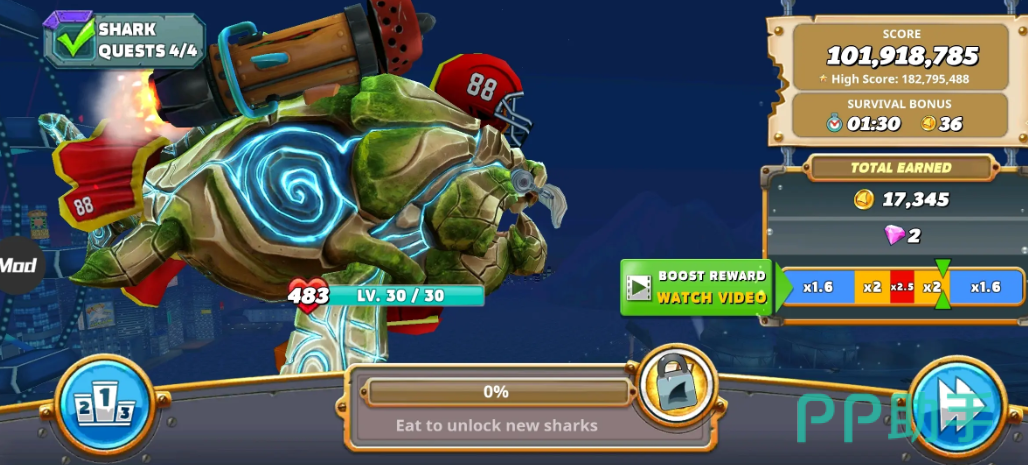 僵尸鲨鱼,拥有非常酷炫的外形及游戏机制,但是偏向于类玩法,强度一般。它能够复活已经死去的猎物,为玩家提供额外的分数。解锁需要1500钻石,75万金币。