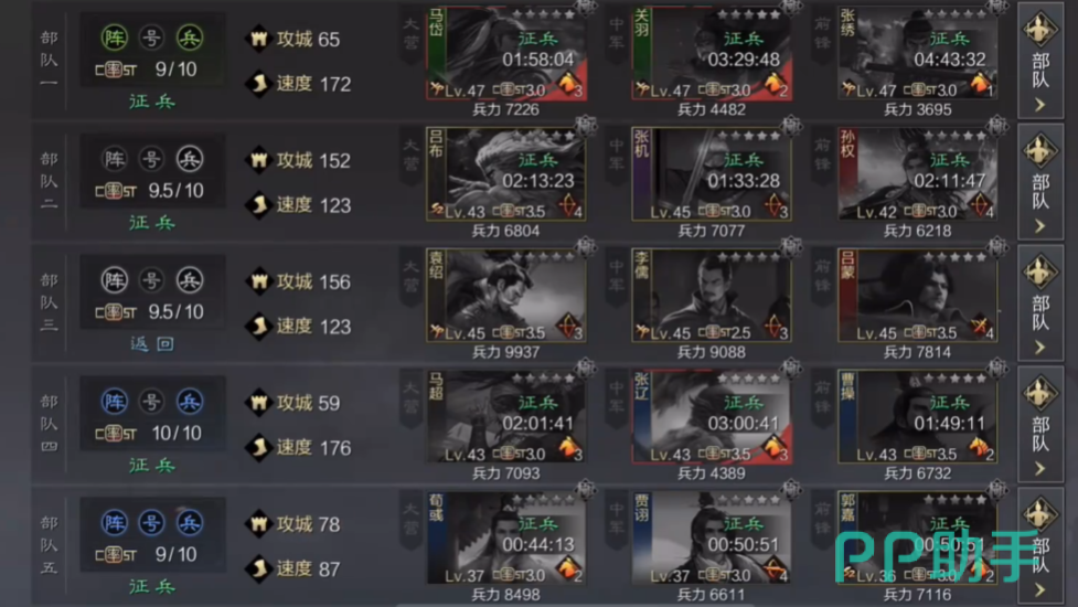 于禁:作为前锋,他的技能“铁壁”能提高部队的防御,适合在前线吸引敌人火力。李通:中军武将,擅长“破阵”技能,可对敌人造成大量伤害。法正:中军武将,技能“烈焰”能有效清除敌人的弓兵。黄祖:中军武将,技能“猛虎”增加部队的攻击力。郝昭:中军武将,技能“破阵”能对敌人打出夸张的伤害。刘虞:中军武将,技能“破阵”同样能主打高伤害。