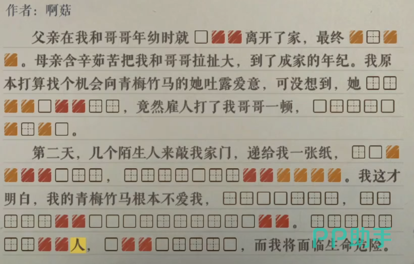 之后在第二天我收到陌生人写的东西,发现青梅竹马不爱我,我还有生命危险。这个关卡第一个核心关键词是死,我们输入之后可以得到父亲已死的信息。第二个关键点是哥哥,输入之后可以得到青梅竹马其实爱的人是我哥哥。接下来最后两个核心词是征兵和残疾。到了这一步,基本上这个关卡就通过了。我父亲在征兵后战死于沙场。后来到了法定年纪的时候,因为青梅竹马喜欢的人是我哥哥,所以提前一步将其打成残废,这样他就不用上战场了。
