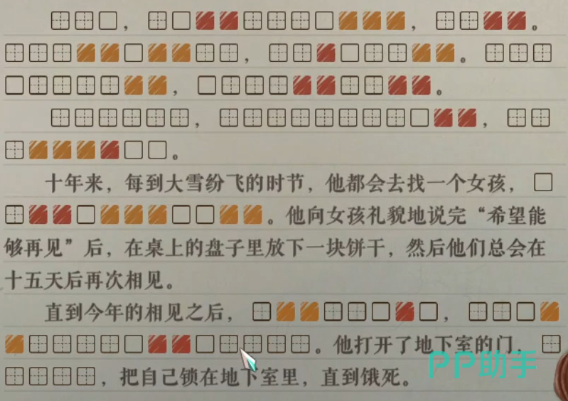 一块饼干也是玩家询问比较多的关卡。关卡谜面是说主人公从十年前开始一到冬天就会去找一个女孩。之后他会说之后能够再见,并且会放入一块饼干,之后会在15天后再见。但今年相见之后,主人公打开了地下室,把自己饿死在了里面。