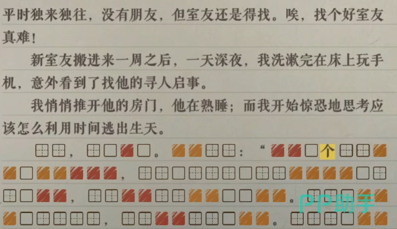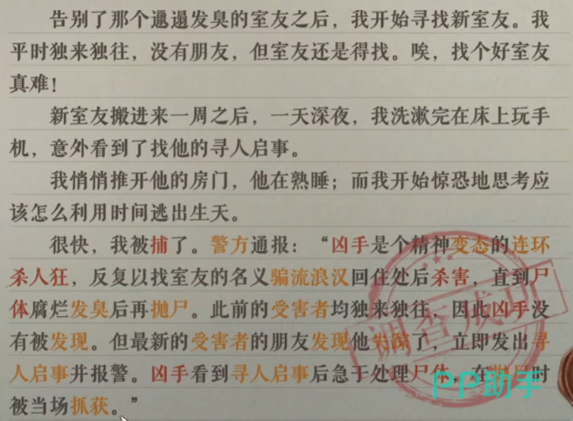 在新的室友搬进来差不多一周的时候,我某天在床上玩手机的时候,意外的看到了他的寻人启事,之后我看到他熟睡后便想着怎么才能逃出生天。这个关卡的内容补充都是在文本之后,首先第一个关键词是尸体,我们在输出之后可以得到文章有尸体的情况。