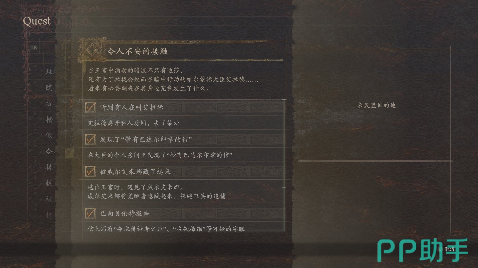 这个令人不安的接触的任务需要大家在酒馆中去领取,之后需要大家穿着卫兵的衣服,潜入到王城中,才可以完成,在到达这个范围后,会有接应的卫兵帮助大家,跟随卫兵的脚步,从后门到达皇宫,进入到皇宫后面的二楼楼梯上,会触发cg,之后就可以知道艾拉德房间这个重要线索。
