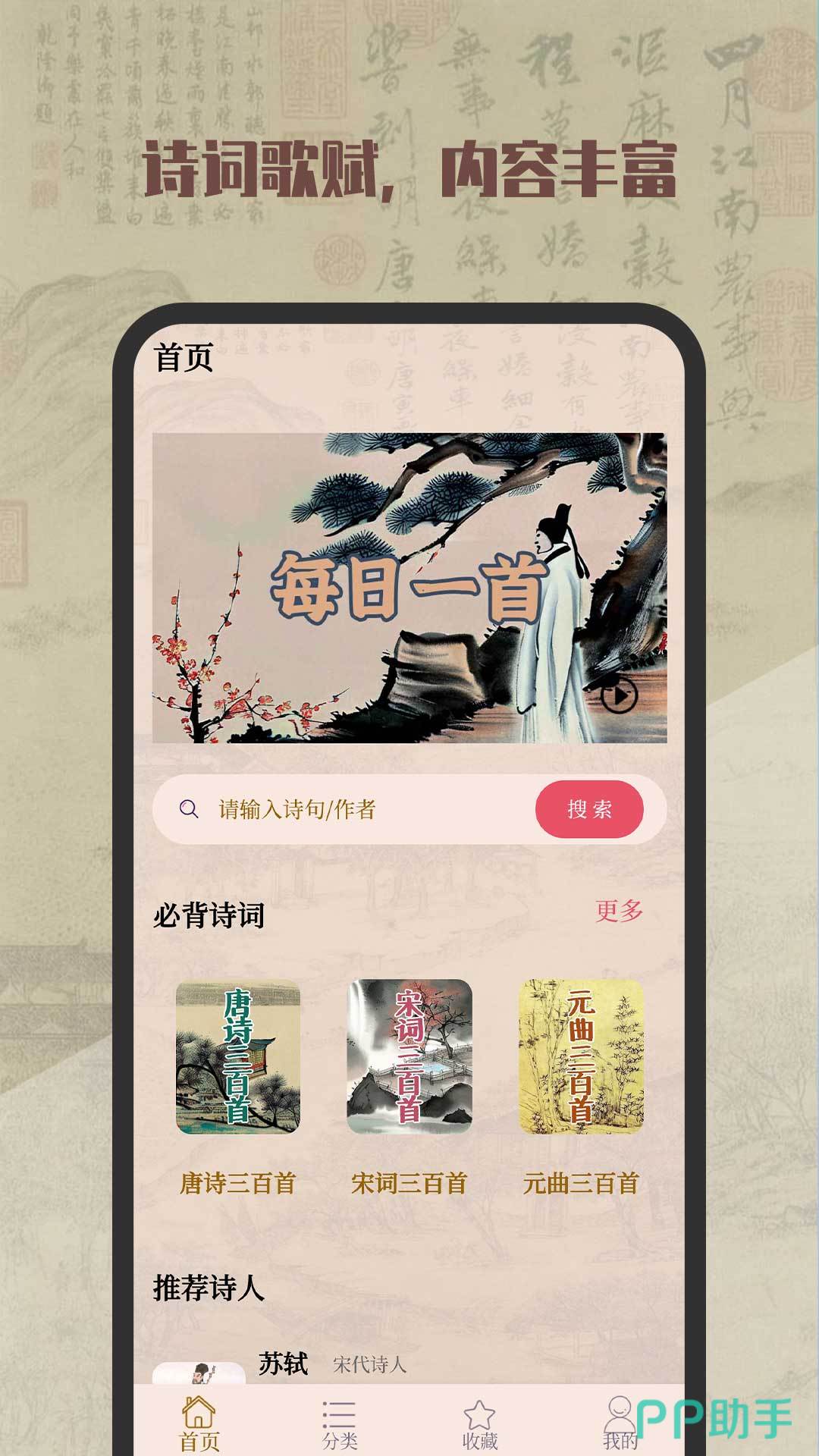 平台的快速支持搜索功能可以帮助用户迅速找到自己感兴趣的作者以及相关的诗词,关于这些诗词的解释等等。强大的搜索引擎加上丰富的诗词注解还有适用于不同年级的必备诗词分享等。