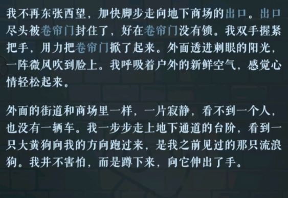 以上这些则是海龟蘑菇汤地下室故事的详解。第二人格则是不愿意接受,因为找不到男主的尸体于是决定去外面找男主,因为第二人格认为男主还活着,因为病毒发作她已经变成了狗所以看不懂短信的文字,于是便出门去找男主了。