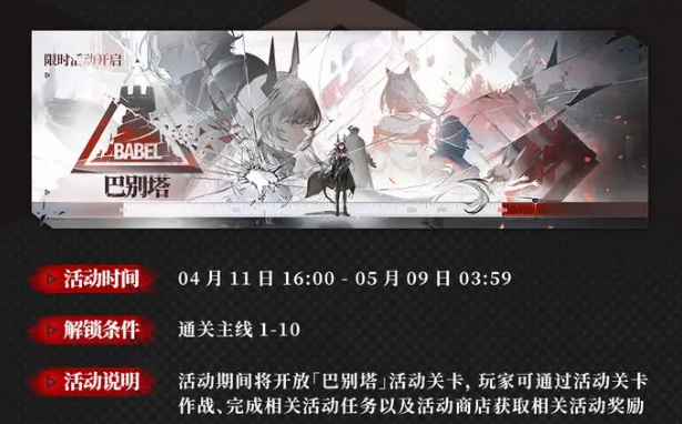 首先活动开启的时间是4月11日16:00~5月9日3:59,这个期间游戏会推出对应的活动关卡,会涉及到巴别塔阵营的剧情,通过关卡的话还能完成相应的活动任务,并从活动商店中获取包含了各种珍稀资源的丰厚奖励。