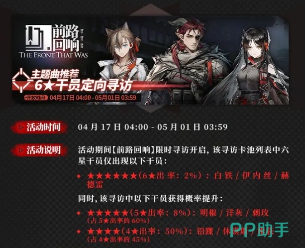 第二个寻访则是前路回响寻访,限时开放时间在4月17日4点~5月1日3:59,其中包含白铁,伊内丝和赫德雷三名六星,此外,明椒,洋灰和刺玫三名五星干员出货率提升,铅踝,休谟斯,维荻三名四星干员的出货率提升。