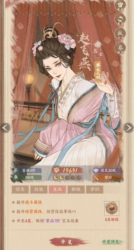 当赵飞燕到达35级后,便可在释放技能切肤吻时有50%的概率使敌方陷入禁疗状态,在打高难度且回血频率较高的敌人时,该状态可谓是神技。更何况在赵飞燕到达蓝品一阶后,被动技柔腰振弓还能在赵飞燕使用普攻时施加破甲,使得赵飞燕身兼两大泛用性极强的特殊效果,令该角色很难被替代。
