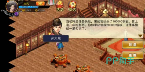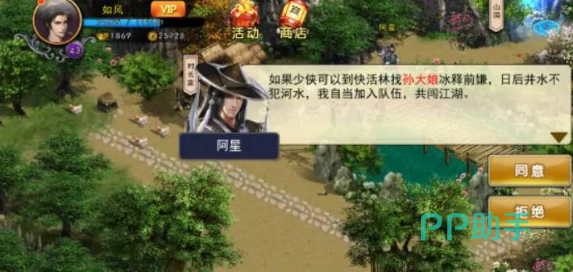 但是在阿星入队之前他会提出一个要求,他会告诉玩家自己从前是一个杀手,但是任务失败被放弃了,所以需要去快活林的金凤楼找一个叫孙大娘的人物同意。