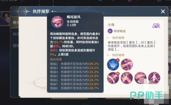 除了上面的三个角色之外,小你好舞也算是游戏的主角团队之一,这个角色是一个女性形象,外观非常可爱,在攻击的时候会闪现到对方身边,所以角色的攻击能力是很强的,这游戏里人物还可以持续输出,这样就可以不断叠加伤害,这是一个比较优秀的输出角色,假如使用蝎尾旋风这个技能,在原有的攻击上还可以叠加骨折的伤害,这样对手的攻击力就会大打折扣。
