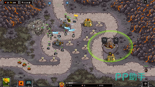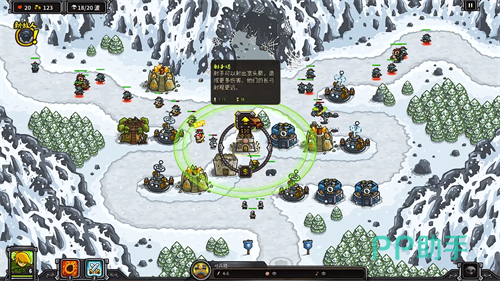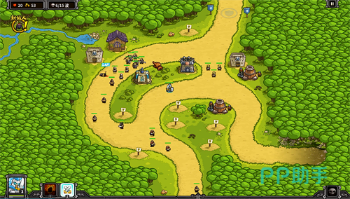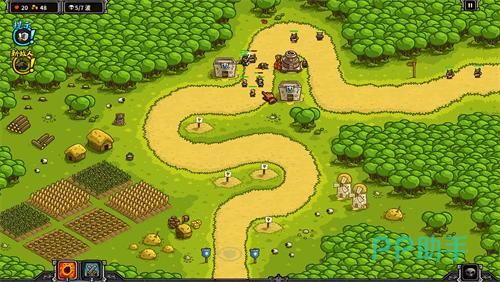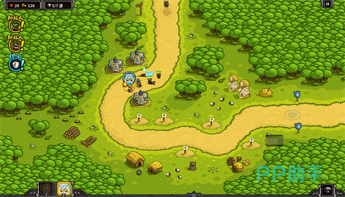 第五关:游戏一开始会提供一个箭塔和左上方的佣兵厂。首先生产三个佣兵到草丛处,以控制两头。主要以箭塔为主,迅速升级到精灵塔,并优先升级蔓藤属性。