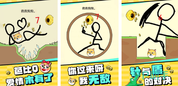 这是一只长的像表情包的柴犬,它有着欠欠的表情,因此这也招来了蜜蜂的反感,纷纷想要给它一点教训,而作为这只doge的主人,你自然要对它的“狗命”安全负责。游戏的玩法简单的同时又有一些烧脑,你需要面对各种不同的地形来为你的狗子搭建防御,避免它招到蜜蜂叮咬,可以是简单的一根线,也可以是复杂的堡垒,毕竟你也不想你的狗子变成蜜蜂小狗吧。