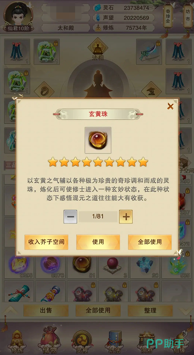玄黄珠在想不想修真可以说是贯穿整个游戏的一种关键性道具了,玩家需要合理利用玄黄珠,以便在想不想修真中获得更快的进展,甚至说提升至更强的实力。