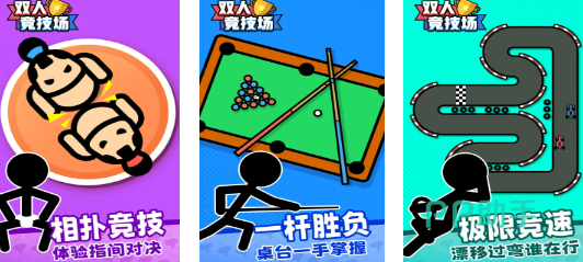 《双人竞技场》拥有多种不同玩法,例如相扑和台球等等,相扑中你需要把对方挤出比赛场地获胜,而台球则需要把你的全部花色球打进获胜,游戏的规则简单明了,要么打败对方,要么竞速比对方更快,给玩家带来的刺激性非常强。游戏中火柴人的角色形象搭配搞笑的音效,给玩家带来无尽的趣味和竞技感。