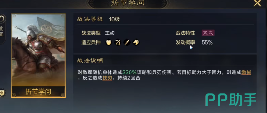徐徐庶这个角色最为出色的特点就是他的核心技能——“折节学问”,这也是他强度的来源。这个技能能够对敌人造成随机的高额攻击伤害,是一个极为强大的技能。更为出色的是当徐庶的目标敌人的武力数值大于智力时,他能对敌人造成缴械效果。相反,如果敌人的智力数值高于武力,则会触发技穷效果,有效地控制敌人两个回合。这样的设计使得徐庶在战斗中具有很高的灵活性和应对能力。