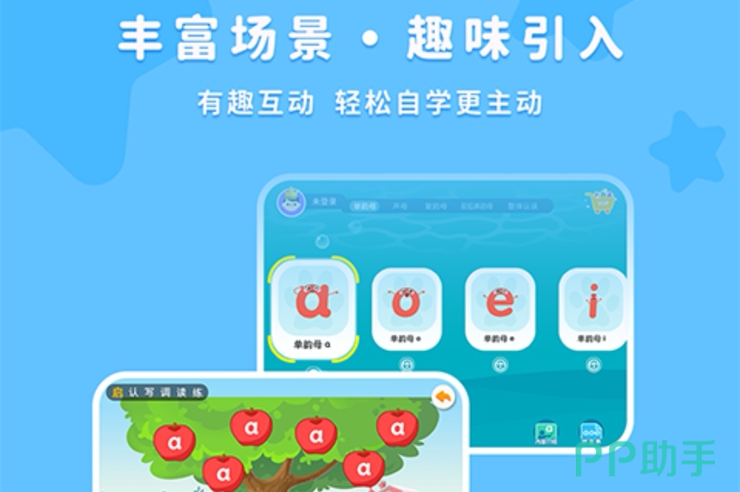 遵循认知发展规律,为同学们提供了有趣的听说读写体验,结合了拼音的音形设计出这样一个丰富的互动学习场景,将汉语拼音的读、写、听都融入到了动画之中。