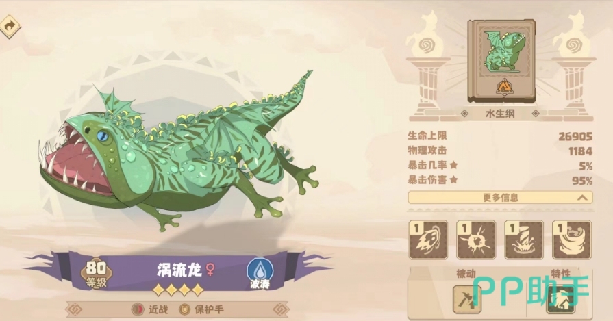 涡流龙:它是一只外形有些类似壁虎的存在,本身也是一头暴击属性非常厉害的母龙,不过定位上它是近战保护手,因此血量和防御的基础数值也不低,在同品质的龙中可以算得上攻防俱佳的存在。
