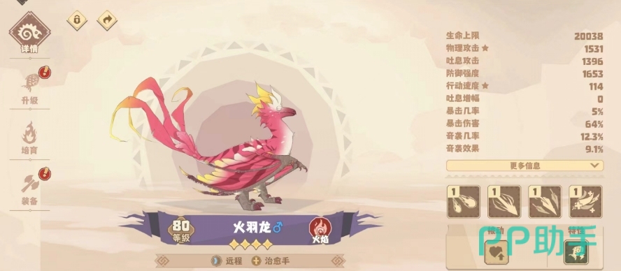 火羽龙:同样是四星中的一位治愈手,它的治疗风格与一般治愈手不同,是通过打输出的方式来治疗友军,属性方面物攻和行动速度都很高,有着不错的基础输出能力,普攻能够造成高额的单体伤害,技能还可以让它在攻击敌人时获取灰烬层数,随着灰烬层数的累计火羽龙会给己方队伍内的残血友军恢复血量,并且具体的恢复量与物理攻击有关,因此治疗效率也很高,被动技能还可以让火羽龙在战斗开局为队友额外回复一次血量,并且主动施放也可以攻击对手并提供灰烬层数。