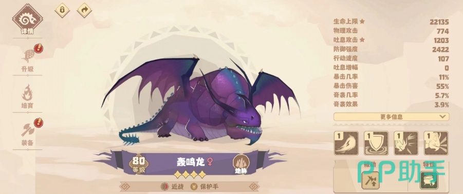 轰鸣龙:这是一只四星地脉龙,从外形上看有着巨大的体型和紫色的皮肤,属性也有着近战保护手标配的高防御和高血量,它的普攻和技能也都比较实用,其中普攻是通过喷火造成一定的吐息伤害,一技能则是依据敌方数量提升自身防御,因此在开局敌人多的时候轰鸣龙的坦度会超高,二技能是一个单体伤害技,加成倍率很高,并且能击退敌人并进行眩晕,控制效果很足,绝招也是一个单体技能,并且有突进有嘲讽,既能够迅速接近对手C位也能够在后续控住它。