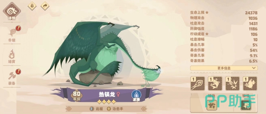 热锅龙:一只四星的治愈手,有着高额的血量因此还能够充当吸收伤害的前排,通过普攻可以对单体敌人打出75%吐息攻击的伤害,一技能还可以为己方血量最少的友军进行治疗和驱散减益,不仅维系了单体友方的续航,而且还让它的输出环境变得更加稳定,二技能还可以补充队伍的输出,在关键时刻进行补刀,绝招还能为全体友方进行回血和驱散减益,算是一技能的加强版,并且治疗倍率也非常高,一级就能够吃到14.4%的血量加成。