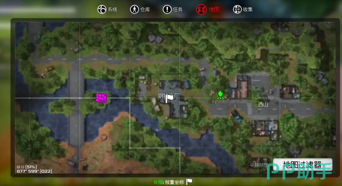 钢铁厂通位于地图的中心区域,可以通过查看地图上的坐标来找到它钢铁厂的坐标是(877°598°),玩家可以根据这个坐标来定位。到达钢铁厂后,玩家需要收集资源,如废弃电子产品和木材,这些都是制造钢材的必需品。玩家可以使用棒球棒损坏电线杆来获取这些资源,但前提是棒球棒需要升级到5级。而且还可以在钢铁厂周围的区域寻找资源,如毒气面罩和大锤,都十分的实用。
