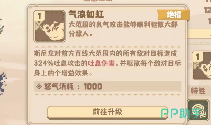 斯尼龙的绝招“气浪如虹”则给予了它强劲的AOE伤害能力,使用后可以直接对前方直线范围内的敌人造成324%吐息攻击的吐息伤害,同时还可驱散每个敌人身上的增益效果,它不论是伤害范围,伤害倍率还是对于增益的驱散都非常实用,可以在重伤敌人的同时,将它们的强化状态也给全部清除。