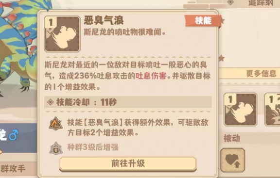 另外一技能“恶臭气浪”也有着不错的单体输出表现,加成倍率高达236%,吃的也是吐息攻击的加成,并且命中单体目标除了能够造成伤害,还可以驱散它的一层增益,因此它不仅可以有效的削减敌人血量,还能消除敌人的强化,以此提升己方的胜利概率。