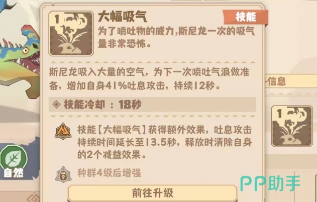 二技能“大幅吸气”也是斯尼龙的招牌技能,此招并不具备直接的伤害能力,不过会通过吸入大量空气的方式来提升自身的吐息攻击,提升比例高达41%,算上斯尼龙本就突出的吐息攻击数值,这次提升后它的输出能力会得到更为明显的提升,值得一提的是这一提升持续的时间也很长,有足足12秒,利用这个时间,斯尼龙可以打出多次强化后的输出。