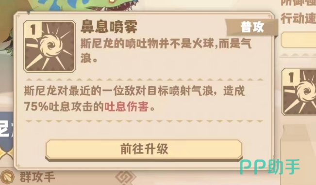 斯尼龙的普攻是“鼻息吐雾”,可以造成75%吐息攻击的单体伤害,和它在吐息攻击上的属性优势不谋而合,能够稳定打出不俗的输出。