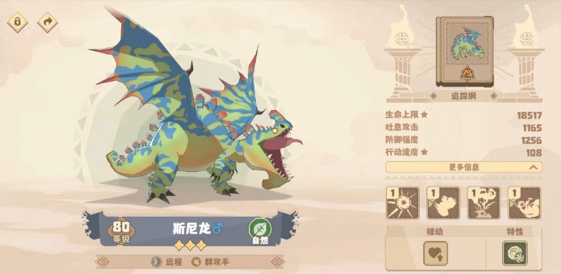 在定位上它属于一只远程群攻手,本身属于自然元素的龙,有着高额的吐息攻击,并且血量和速度也十分不错,在同等品质的龙里面它的这些属性数值算得上非常有优势,而且最高的吐息攻击也能够让斯尼龙的整体输出更高。