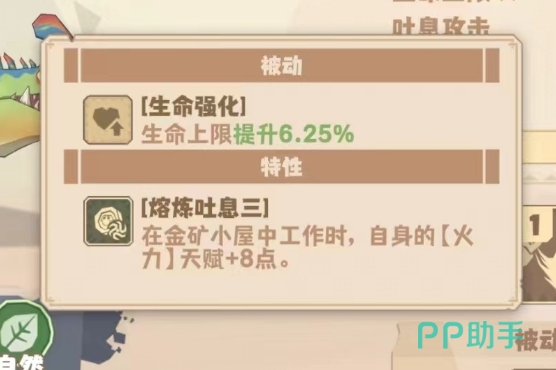 而“熔炼吐息三”这一特性则可以令其在金矿小屋中工作时增加自身八点火力天赋,火力天赋越高那么在金矿小屋的工作效率就越强,因此如果缺少金矿资源的话利用斯尼龙你还可以有效提升金矿的产出效率。