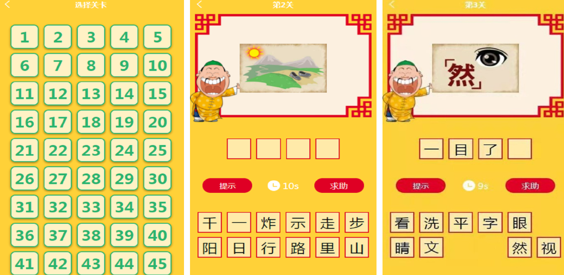 《猜成语不嘛》也是猜字词的游戏,游戏画风清新,每个关卡中字词的提示样式也不同,比如一幅风景画或者字和图案结合在一起,玩家只需要根据图中的意思猜出成语即可。不过每个关卡都有时间限制,一般是10秒,如果在10秒内猜不出来的话,还可以点击提示或者求助,一般情况下都会出现一半的提示,大家根据提示以及图案结合起来即可通关。