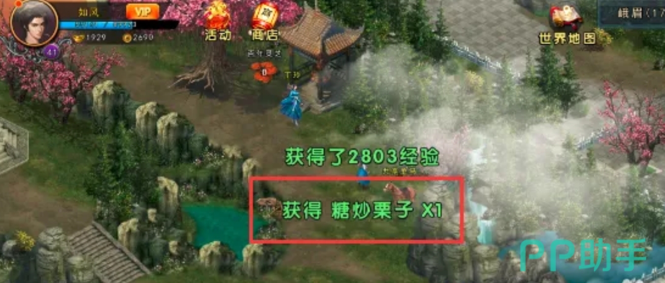 在领取完任务后我们还需要两样游戏道具才可以采集猴儿酒,一样是糖炒栗子,一样是细口罐子。其中糖炒栗子的获取方法是:点击任务栏的倚天剑任务,根据剧情引导,然后完成“峨眉捉迷藏”的小游戏,游戏成功完成就可以获得这个道具了。
