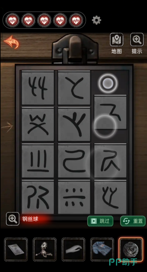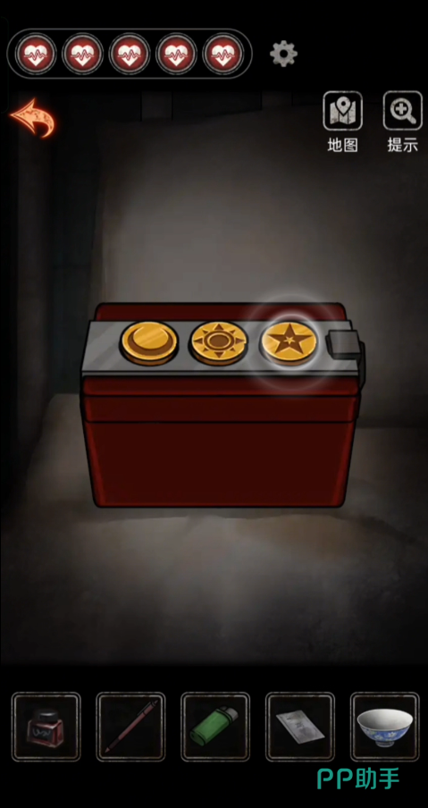 收集到信息之后返回2009使用钥匙进入病房,探索场景得到【星星饰品】、【空碗】、【工艺品】。然后往下走打开柜子得到一个密码锁,然后根据顺序【12435】打开获得一个太阳饰品。我们返回之前有镜子的房间内,把收集到的所有饰品都放在床上的红色盒子上就可以获得【玻璃罩子】,然后点燃镜子前的蜡烛之后使用玻璃罩子盖好,再把碗放在镜子前面倒好墨水,用笔敲碗。