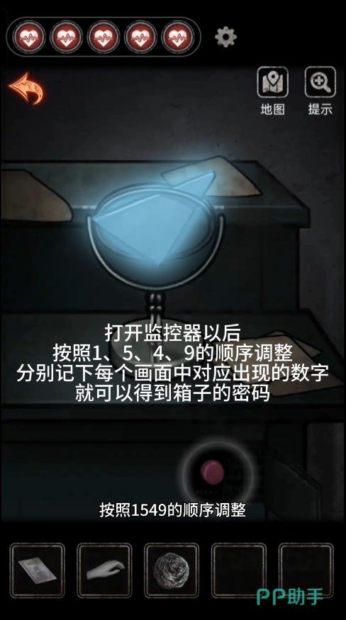 进入保安室后将碎片放在镜框上面按照提示调整镜子,然后点击风扇开关得到【钥匙】,打开监控桌子上的盒子点按钮,然后再去点击床上的箱子获得监控键盘线索【1549】,得到床上箱子的密码【2731】得到医生碎片,拼好之后获得【照片】和【钥匙】早床头柜里得到【指甲刀】,进入娱乐室,在桌上获得纸条根据提示打开下面柜子得到【痒痒挠】,在风扇使用痒痒挠和钢丝球就可以拿到【熟料小剑】,在告示牌那使用指甲刀获得,在角落的拐杖放上假手获得【假手拐杖】。