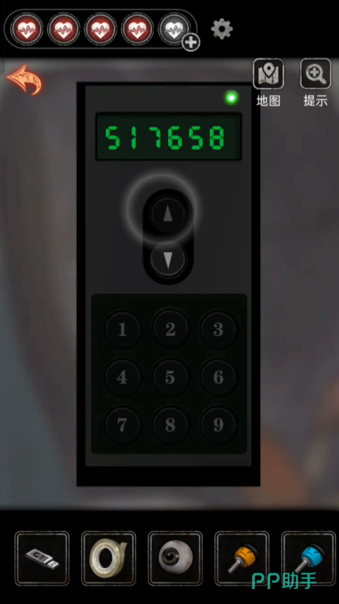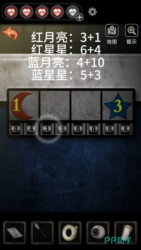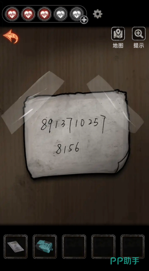 在抽屉里拿到刘医师的卡之后出检查室往左走使用卡进入心理室拿到【u盘】和【胶带】,返回检查室使用u盘得到提示,进入心理室在布偶堆里拿到手套和密码提示,剪开手套绳子,按摩椅密码【517658】得到木偶,点击沙盘后面的天平,左边放上发圈和玩偶,右边放上红旗得到【纸条】。