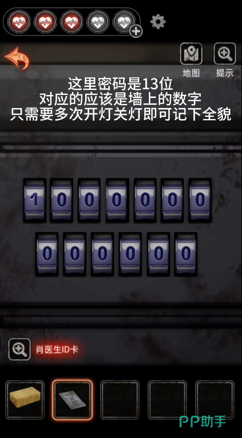 进入3013房间后,不停的开关灯来调整木偶的位置和姿势得到密码【2305418392747】打开箱子得到【钥匙】,进入物理治疗室得到【收音机】,然后再左边箱子里得到废旧仪器和控制器,回到3013病房,把收音机放在桌上,在木偶身上拿到天线,在窗户上拿到磁铁。