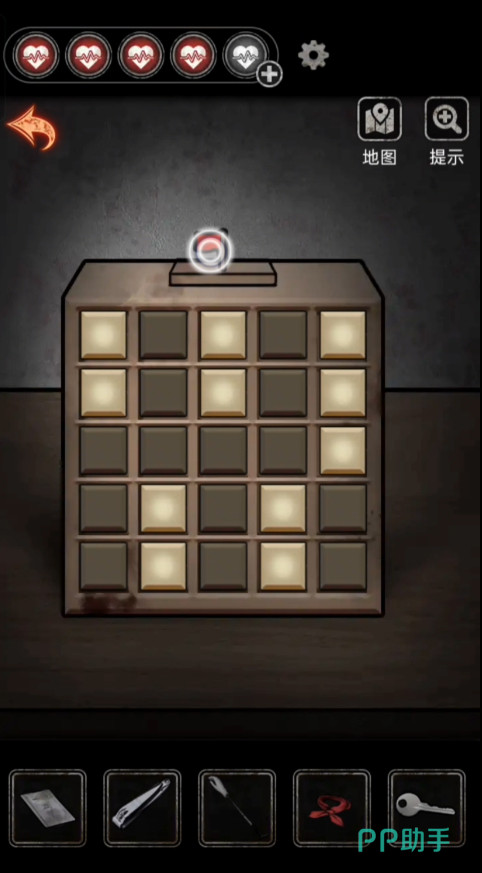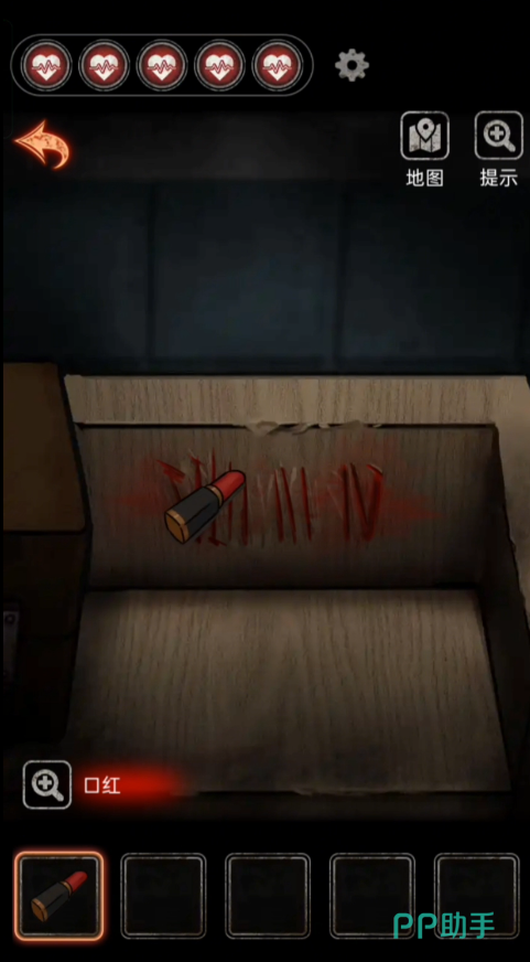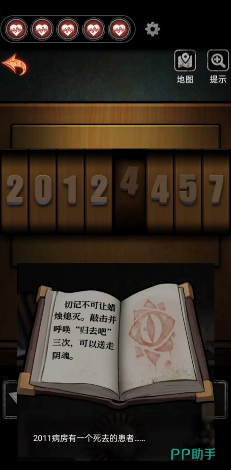 回到床头,在床头得到纸条提示,然后再返回刚刚遇到高能的门口,找到右下方的盒子,根据门口看出去的数字获得盒子的密码【2011】,在打开盒子之后拿到道具【口红】。往右边走点击床上的小枕头就可以拿到一个小的密码箱子,然后搜寻桌子上得月亮形状的物品道具,使用【口红】划开木头上面的印记就可以成功获得箱子的密码,拿到【钥匙】。使用钥匙打开轮椅下面的锁链之后就可以移开轮椅拿到衣服下面的【钥匙】,然后使用钥匙打开病房的门。