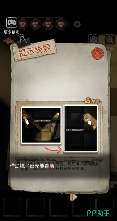 玩家们在成功进入游戏内后先检查柜子,因为钥匙断裂了,玩家们需要去寻找到工具抽屉,在柜子下面可以找到一份自己的病历,点击夹子就可以获得道具【夹子】,然后使用【夹子】夹住钥匙打开抽屉,利用抽屉里的镜子反射,点击左边的箭头在门旁边找到灯光的开关,在拉开门上的帘子时会有一个小惊吓点。