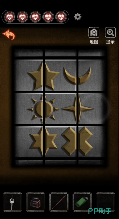 往左下方进行探索,进入办公室里,搜寻办公桌,在第二层的抽屉里可以拿到【小零件】和【打火机】,在桌子上面的笔盒里面按到【圆珠笔】、【红墨水】,然后再在旁边的墙上拿到【钥匙】,在地上拿到棕色的笔记本,然后将零件放好。这里的解密答案是【以中间为主,太阳图案放在左侧的第二行】,解开谜题之后就可以获得ID卡和密码的提示线索,房间编号和患者的编号。