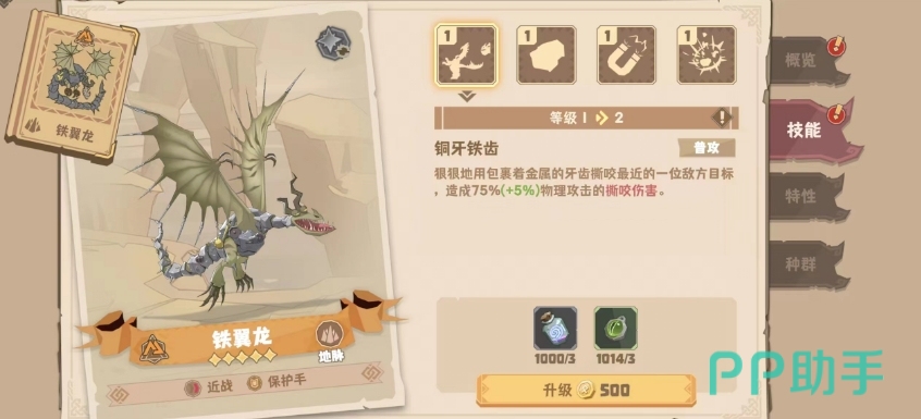 铁翼龙:这是定位偏前排的一只奇幻纲龙,技能主要是围绕增强坦度来构建的,一技能可以通过被动每三秒获得一层铁甲从而提升自身的防御,这个铁甲每层都能加6.3%的防御,并且最多可叠36层,叠满后铁翼龙的坦度将变得非常高。
