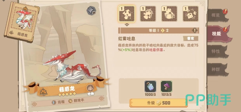 菇惑龙:它也是一个奇幻纲里面的一个群攻手,技能稍显花哨,都是用孢子寄生对手从而产生AOE伤害,典型的就如一技能可以在打出117%吐息攻击的单体伤害后为目标寄生一个孢子,孢子累计达到七个或目标阵亡都会令其爆炸从而波及范围内的所有敌人。