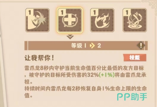 一技能“让我帮你”则是雷爪龙的核心技能,首先它的基础效果就足够强大,可以让雷爪龙在把秒内守护当前血量百分比最低的队友,守护后,它所受的32%伤害都将转移到雷爪龙身上,由雷爪龙为它代替承担,同时这段时间内雷爪龙每两秒还可以恢复自身1%的血量。