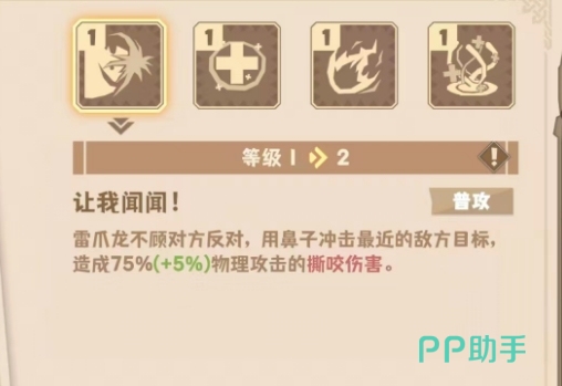 普攻“让我闻闻!”是一次75%物攻的单体撕咬伤害,最高可达到120%的物攻加成,它的效果平平无奇,但攻击动画比较有趣,会用鼻子去撞击目标。