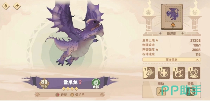先看属性的话,会发现它的生命值和防御强度都非常高,虽然只是一只四星龙,但27305的生命上限比一些五星龙也不遑多让,同时超越两千的防御也让它在承伤时能有更加亮眼的表现。